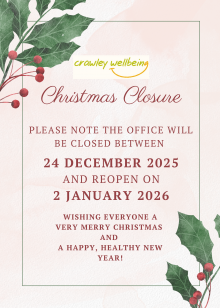 Please note that the Crawley Wellbeing office will be closed for Christmas from Tuesday 23rd December at 5pm until Friday 2nd January at 9am.